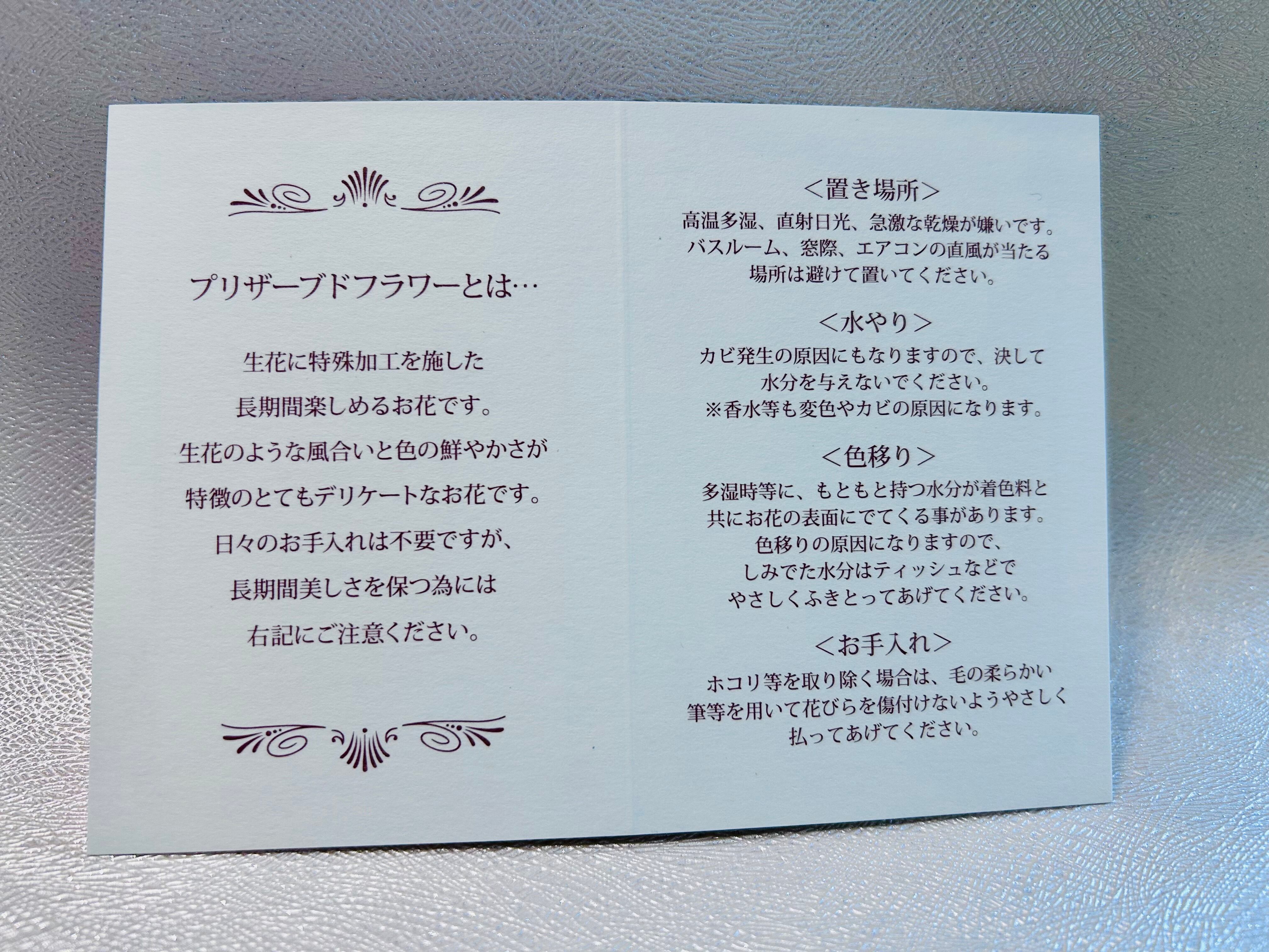 アレンジメントを入れる手さげバックとプリザーブドフラワーの楽しみ方カードお入れして発送させていただきます。