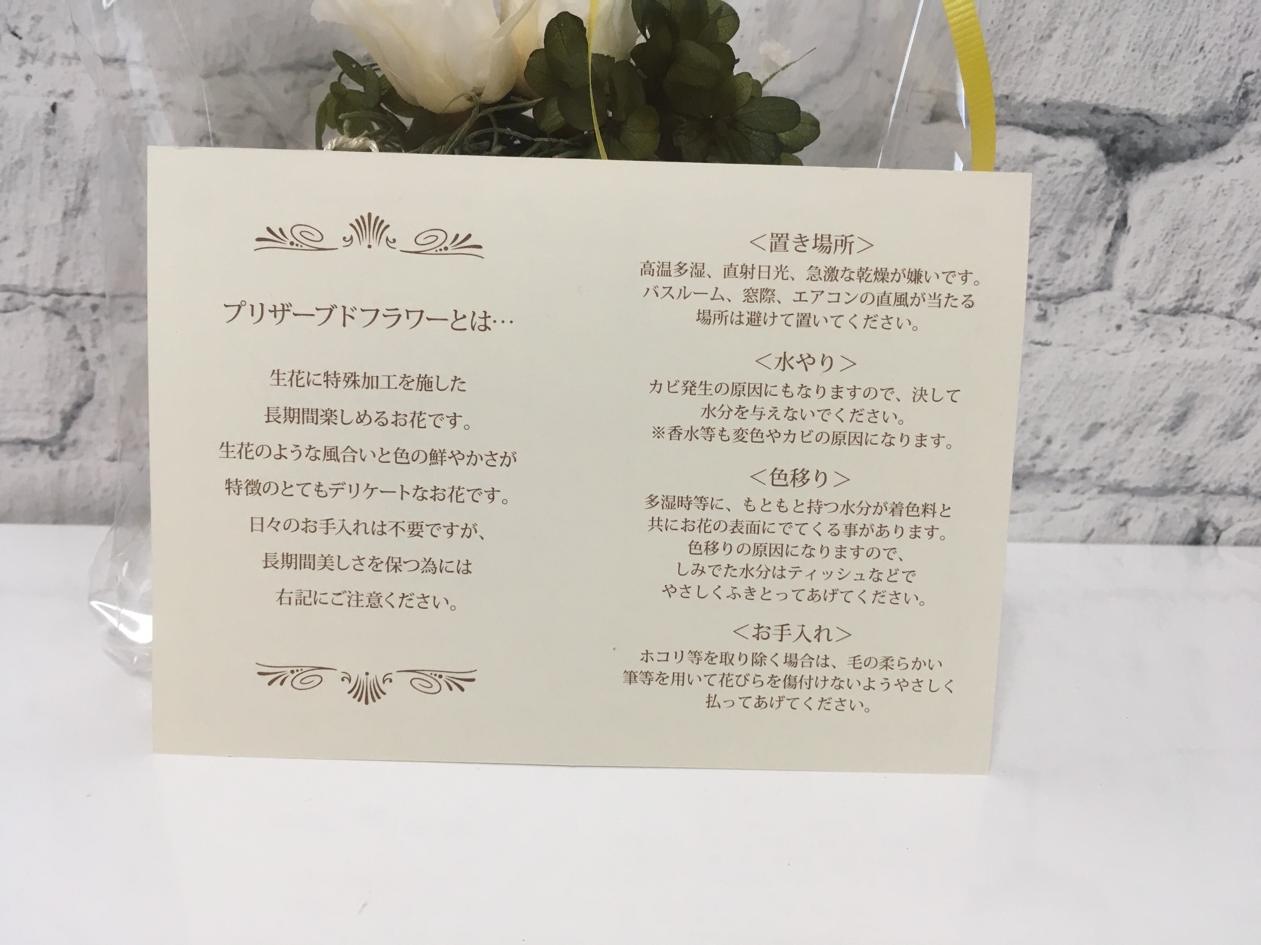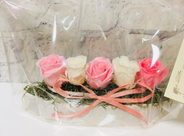 ピュアホワイトとピンクのバラが寄り添うプリザーブドフラワー。